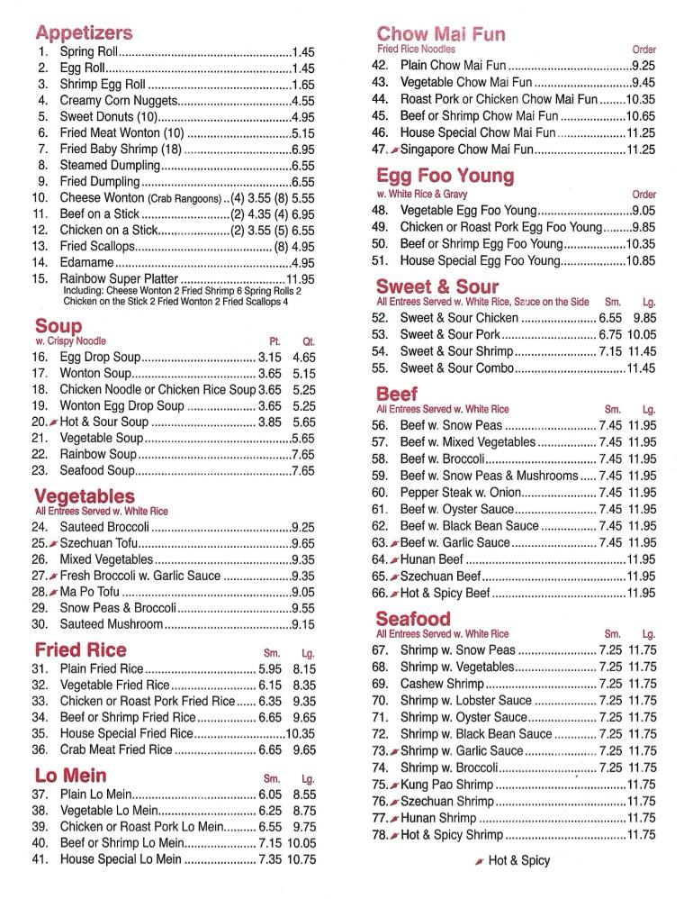 The menu at Rainbow House Asian Bistro showcases an impressive array of dishes from appetizers to entrees. Start with tasty spring rolls or wontons to whet your appetite, then move on to hearty entrees like beef with snow peas or sweet and sour pork.